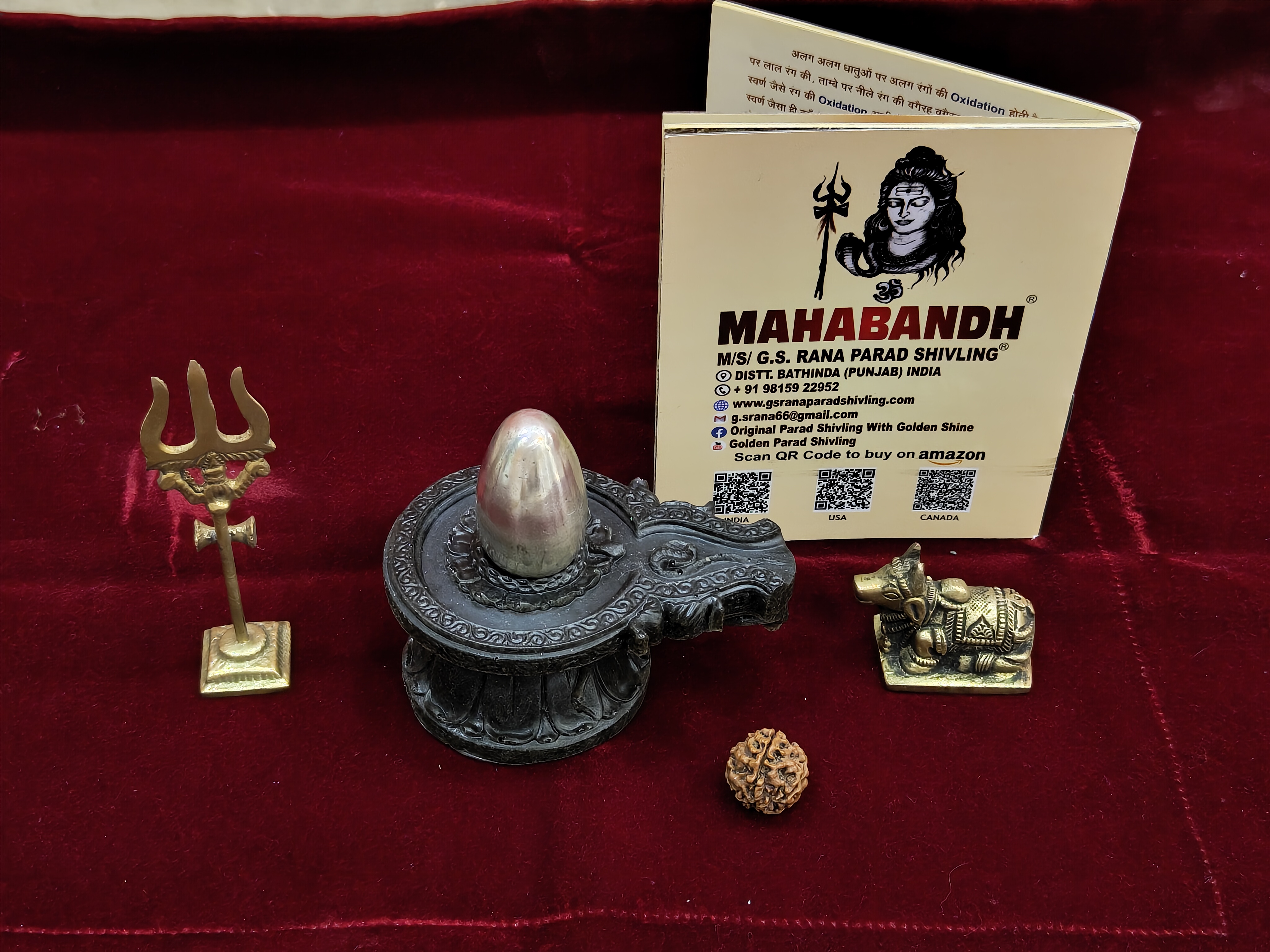 What is in the box? PARAD SHIVLING, ABHRAK YONI BASE, BRASS TRISHUL, BRASS NANDI, 5 MUKHI RUDRAKASHA, GUIDE BOOK